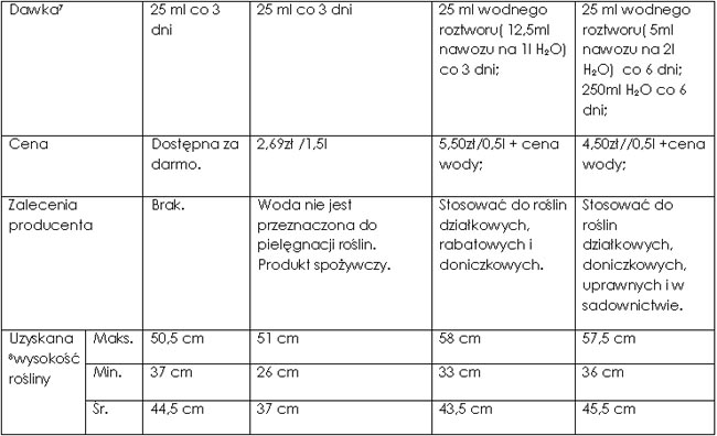 Woda rzeczna. Wysokość pędu rośliny uzyskanego przy pielęgnacji tym rodzajem wody przeszła nasze oczekiwania. Łodyga urosła na wyjątkowo dużą wysokość przy porównaniu z innymi sadzonkami. Użycie tego środka jest najtańsze więc , w tym wypadku, także najkorzystniejsze. Oprócz ekonomiczności użycia tego środka doszliśmy też do innych wniosków. A mianowicie, nie znając składu wody rzecznej, możemy śmiało wysunąć tezę, iż woda ze Słupi jest bogata w mikroelementy i związki mineralne, przy czym tez nie jest zanieczyszczona szkodliwymi toksynami mogącymi źle wpłynąć na rozwój rośliny.