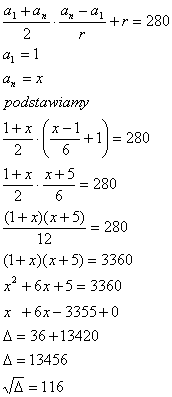,którego suma jest równa 280 ostatni wyraz to 55.